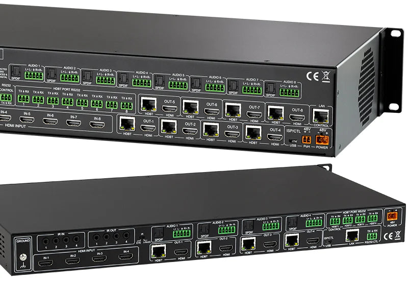 Diese 18-Gbps-HDBaseT-Matrix-Switches mit 8x8- und 4x4-Konfigurationen für 4K60 (4:4:4) und ICT (Invisible Compression Technology) bieten unkomprimierte, gespiegelte HDMI-Ausgänge, IR-Routing, RS-232-Signalmanagement, Skalierung sowie Audio-Matrixing und Audioverzögerung.