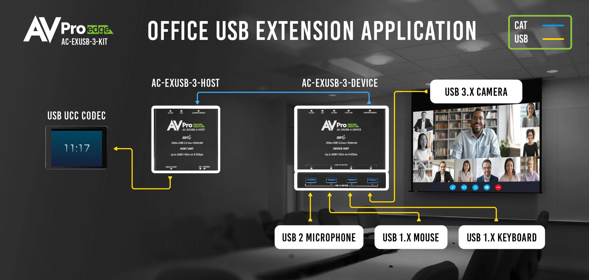 USB-Signale stellen jedoch eine größere Herausforderung dar, da USB 3.X über passive Kabel auf nur ca. 3 Meter (9 Fuß) beschränkt ist. Doch AVPro Edge nutzt sein Know-how aus der Videoübertragung, um diese Grenze zu überwinden.