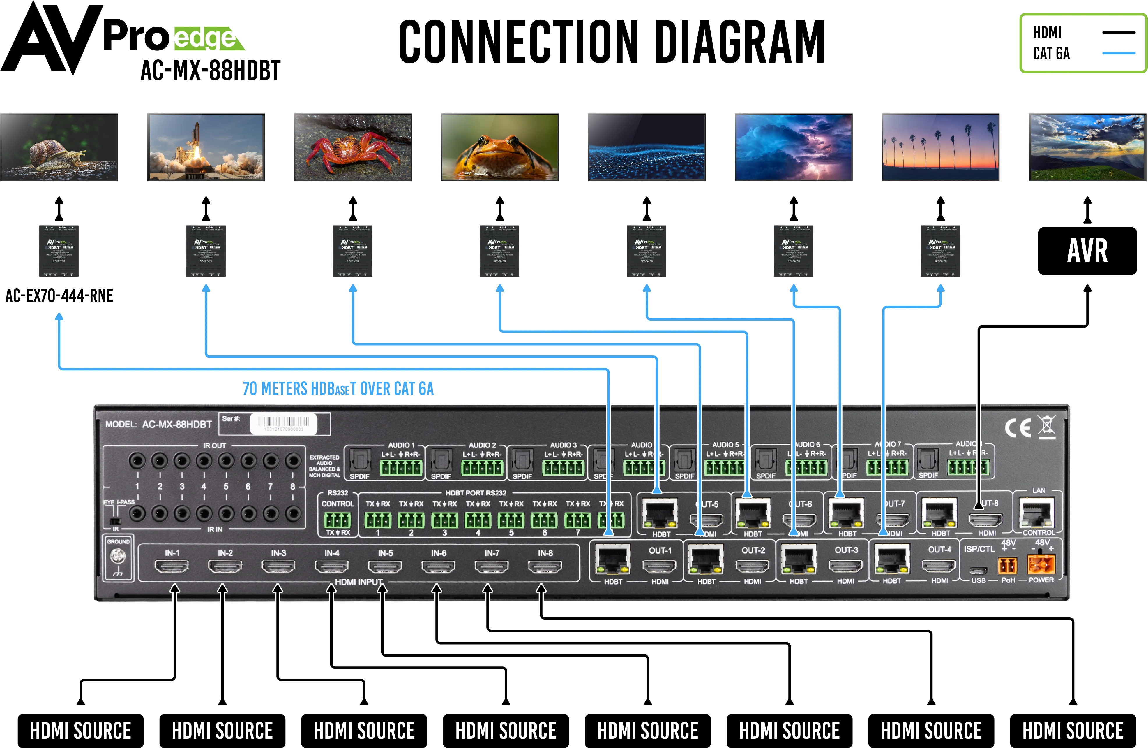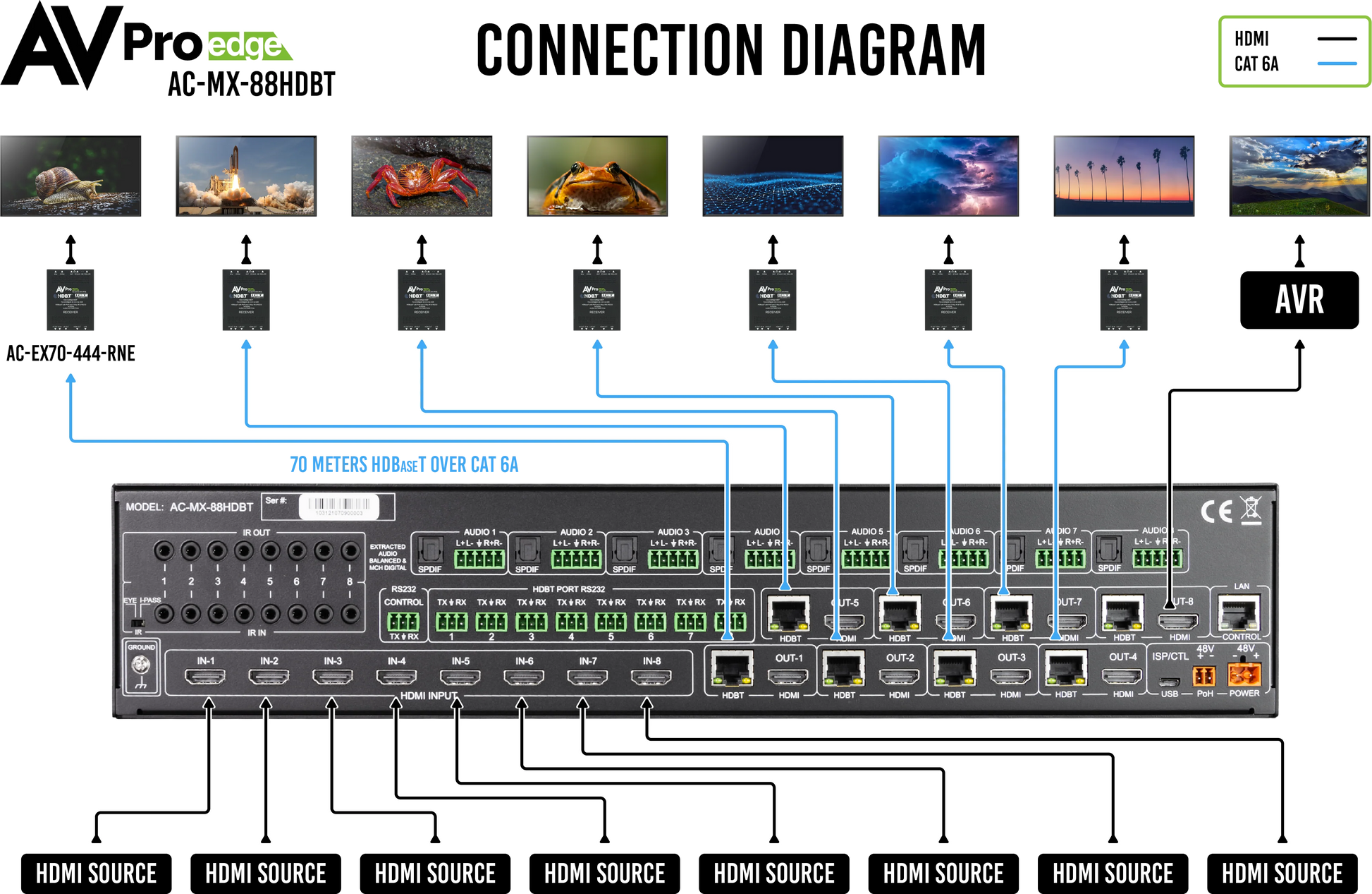 Der AVPro Edge AC-MX-88HDBT ist ein 8x8 HDMI/HDBaseT-Matrix-Switcher mit acht HDMI-Eingängen und acht kombinierten HDMI-/HDBaseT-Ausgängen.