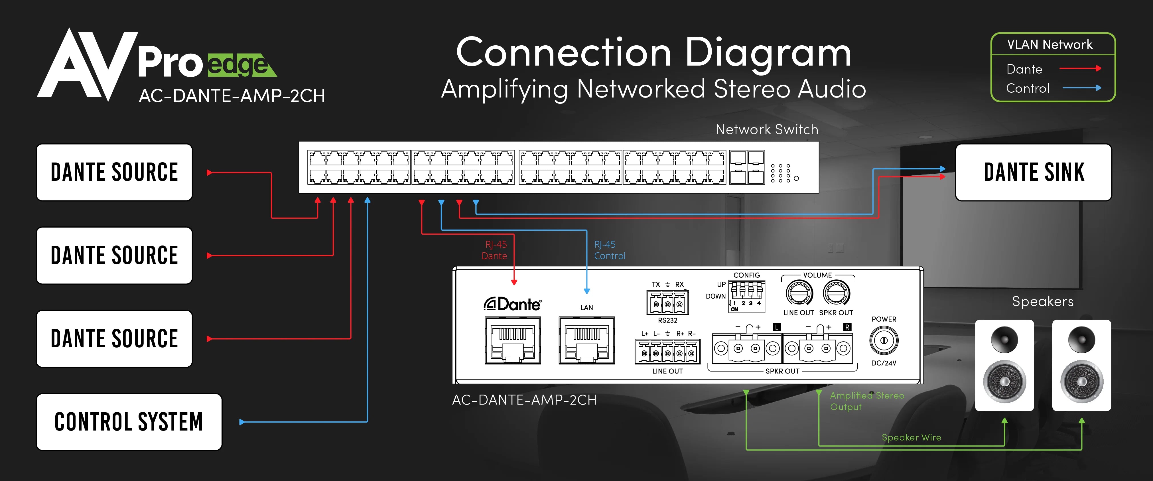 Der AVPro Edge AC-DANTE-AMP-2CH ist ein kompakter 2-Kanal-Audioverstärker mit 25 Watt RMS pro Kanal bei 4 Ω (bzw. 12,5 Watt RMS bei 8 Ω) und integriertem Dante™ / AES67-Decoder.