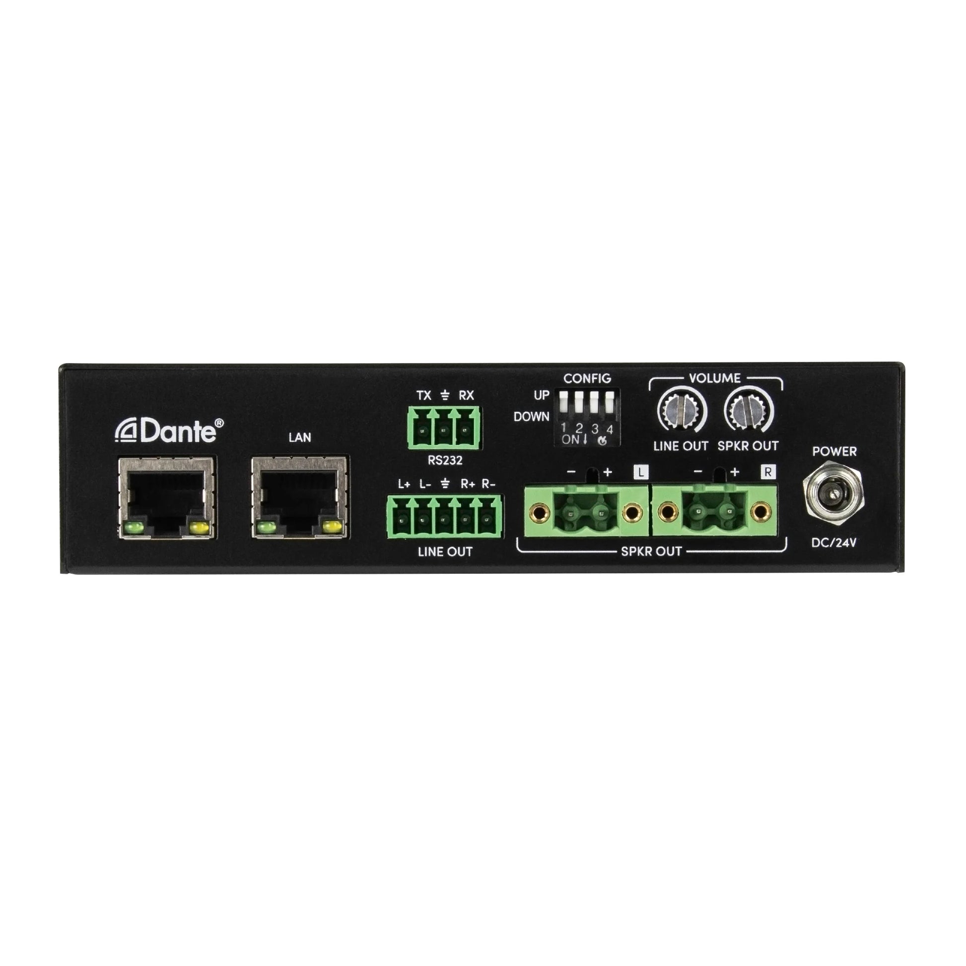 Das verschlüsselte Dante-Audiosignal wird über den dedizierten RJ45-Netzwerkport empfangen, anschließend digital-zu-analog gewandelt und über zwei gesicherte 2-Pin-Anschlussklemmen als Lautsprechersignal ausgegeben. Zusätzlich steht ein 5-Pin-Anschluss für Line-Level-Audio zur Verfügung, um das Signal an weitere Verstärker weiterzuleiten.