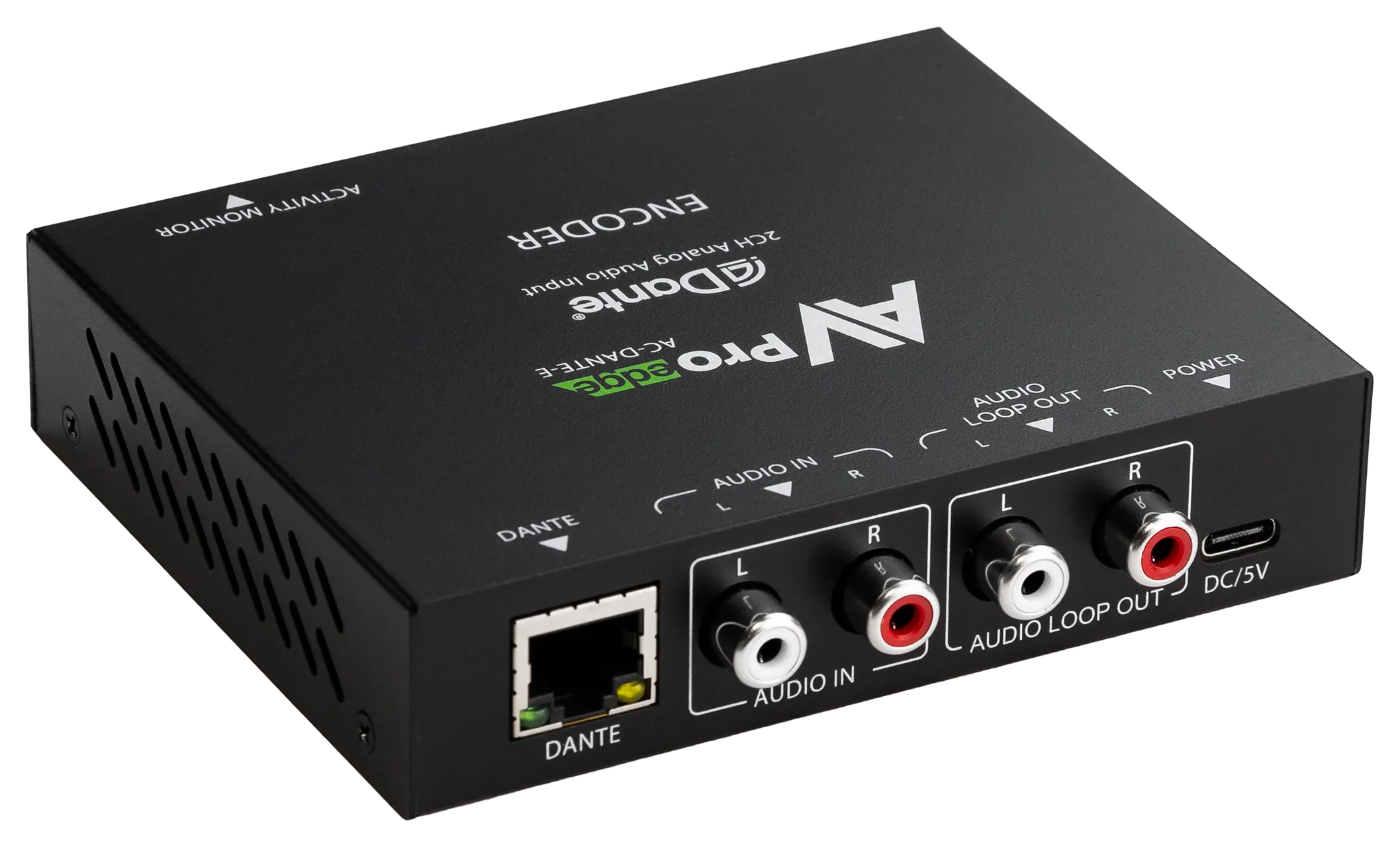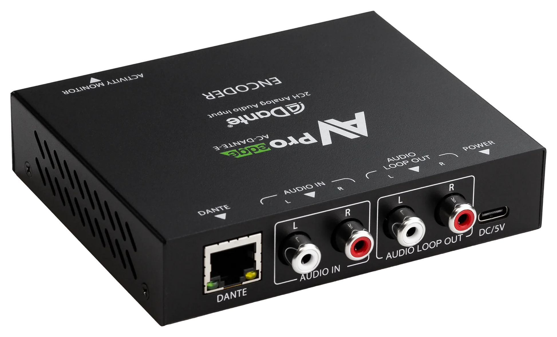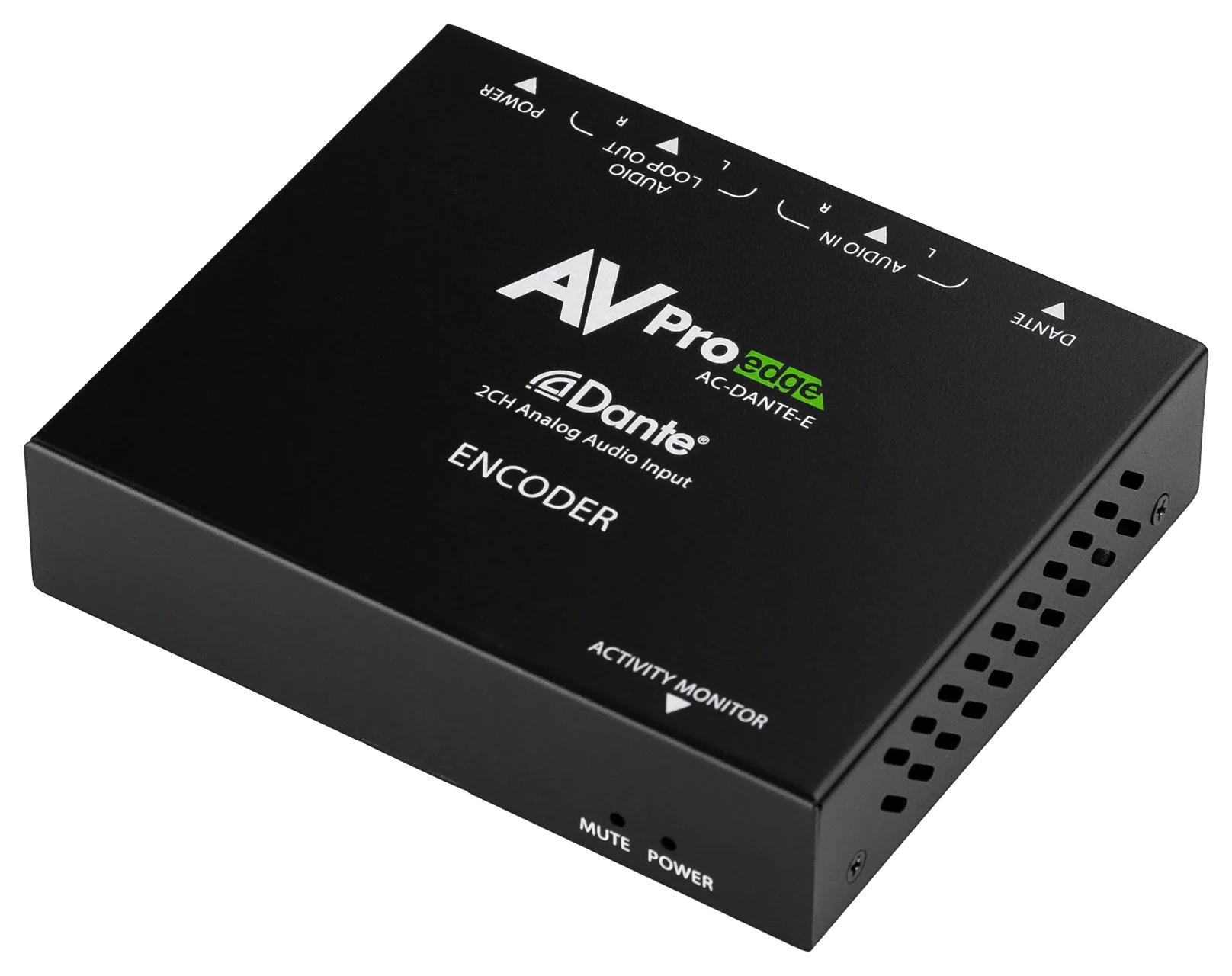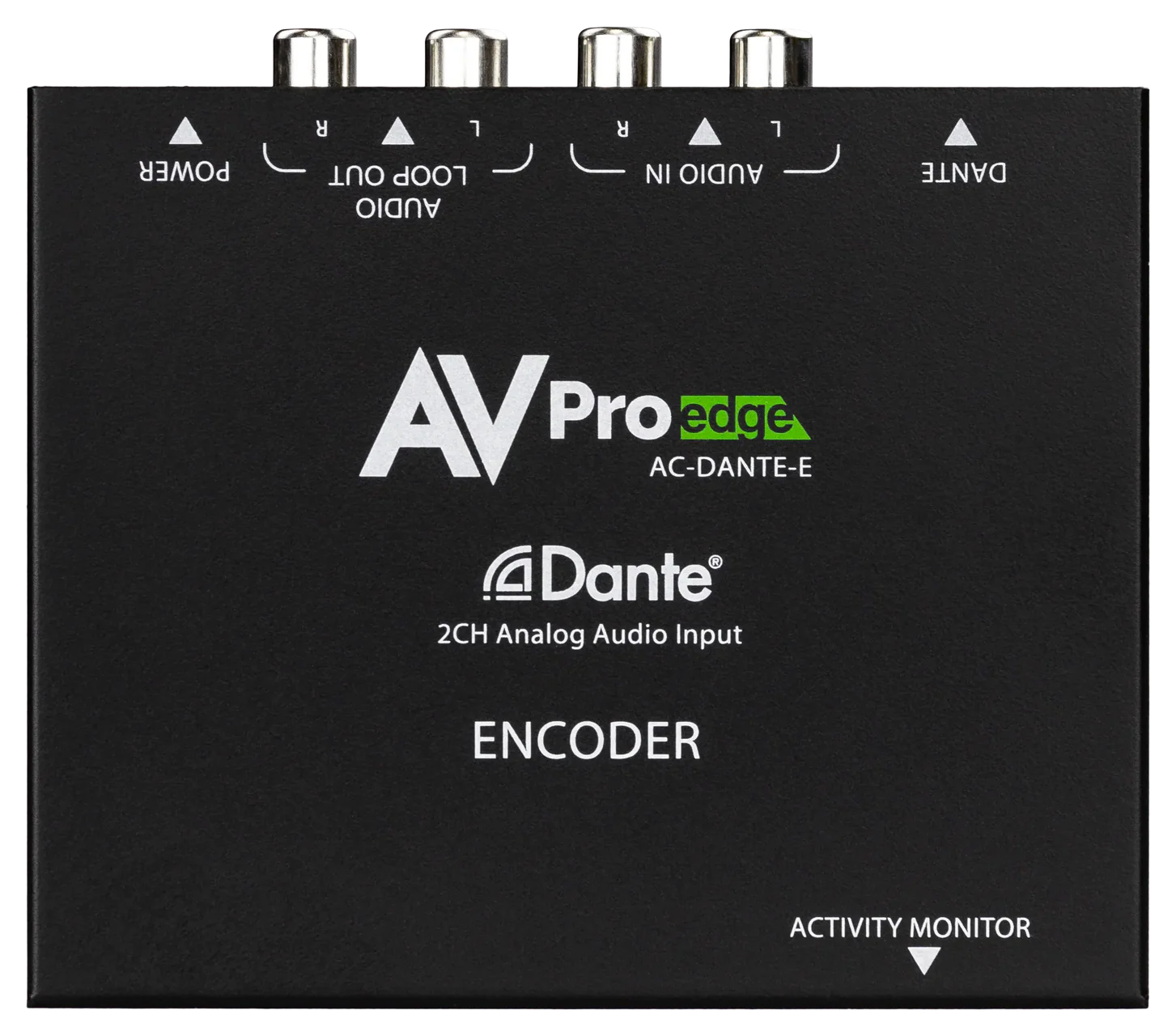 Der AVPro Edge AC-DANTE-E ist ein kompakter, zweikanaliger Analog-Stereo-zu-Dante-Encoder. Analoge Audiosignale von Quellen mit Stereo-RCA-Ausgängen, wie CD-Wechsler, Streaming-Media-Player, CATV/DBS-Set-Top-Boxen, Bandmaschinen sowie Tuner für FM/HD-Radio, Internetradio und DAB+ (verbreitet in Europa, dem Nahen Osten, Asien und Ozeanien) können vom AC-DANTE-E digital kodiert und über ein Dante-Netzwerk an andere Geräte verteilt werden. Installationen in Kirchen, Bildungseinrichtungen, Hotels/Konferenzräumen sowie Restaurants/Einzelhandel mit unterstützender Technik wie Mischpulten, SD/USB-Recordern und Computer-Audio können Dante-Geräte für hochwertige, nahezu latenzfreie Übertragung von Sprach- und Musiksignalen nutzen. Der Loop-Out des AC-DANTE-E ermöglicht eine analoge Signalweiterleitung im ursprünglichen Signalpfad.