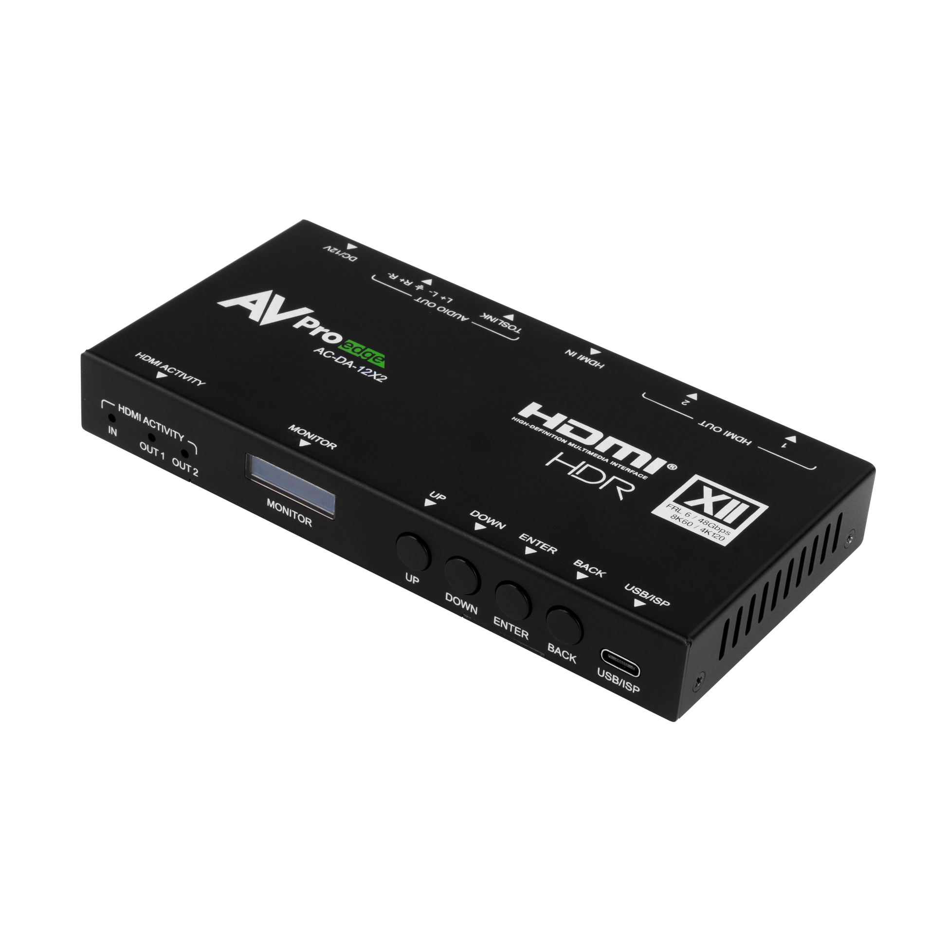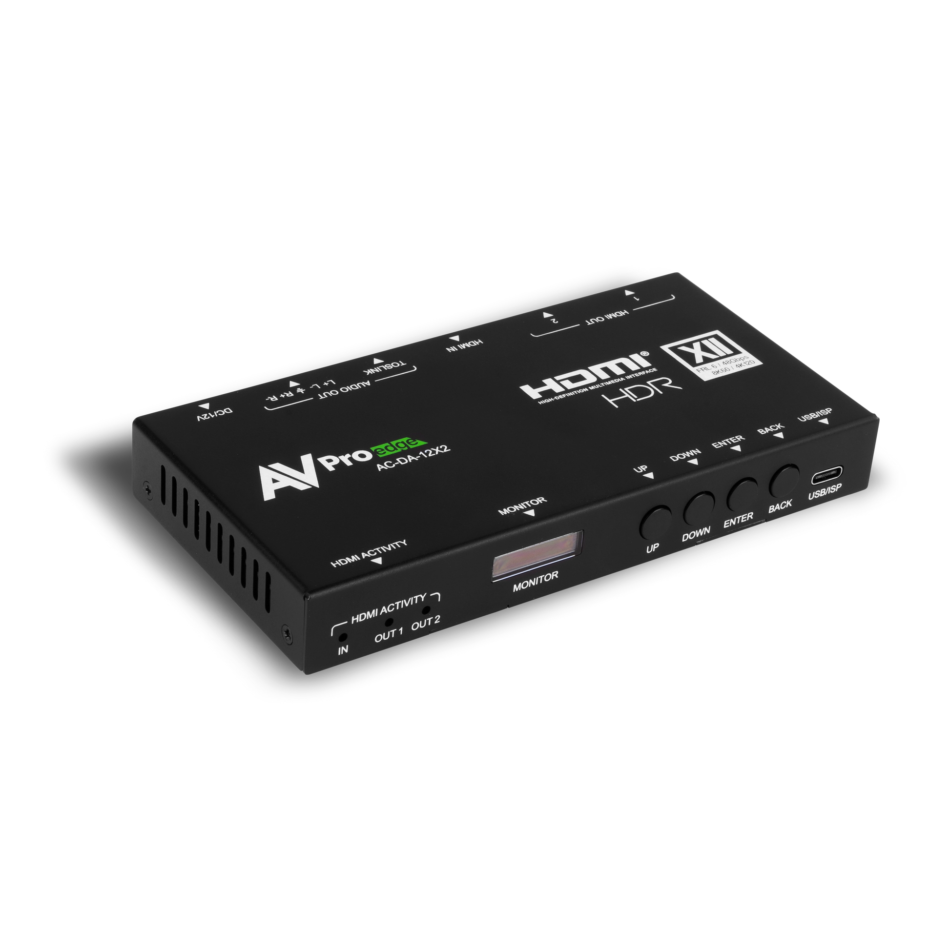 Der AVPro Edge AC-DA-12X2 ist ein 1x2 HDMI 2.1b Distribution Amplifier mit 48 Gbit/s Bandbreite, der eingehende HDMI-Signale bis 8K/60 fps in zwei separate Ausgänge aufteilt – fehlerfrei und ohne Qualitätsverlust.