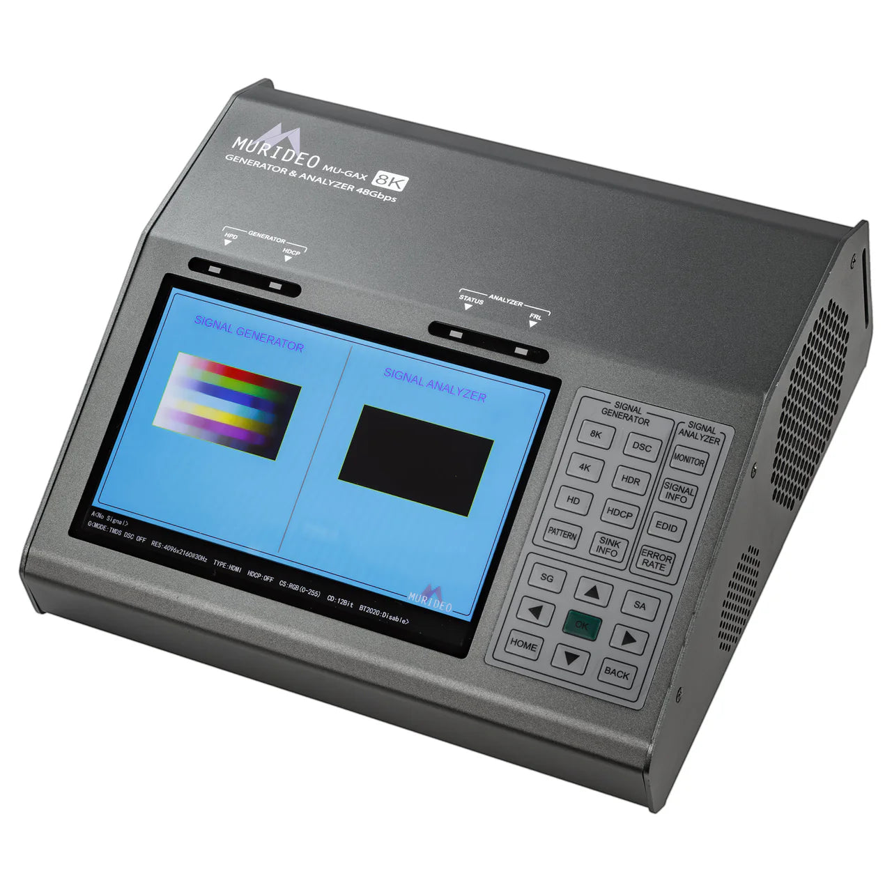 Der MU-GAX-8K erzeugt 36 Testmuster bei Datenraten bis zu Fixed Rate Link 6 (48 Gbit/s) und ist kompatibel mit HDCP 1.4/2.3 sowie 4K/8K. Ein hochauflösendes 7,5-Zoll (19,05 cm) LCD-Display zeigt die erzeugten Muster an und dient als Achtkanal-VU-Meter, Fehlerzähler und Informationsquelle für HDMI-Audio- und Video-Leistungsmetriken.