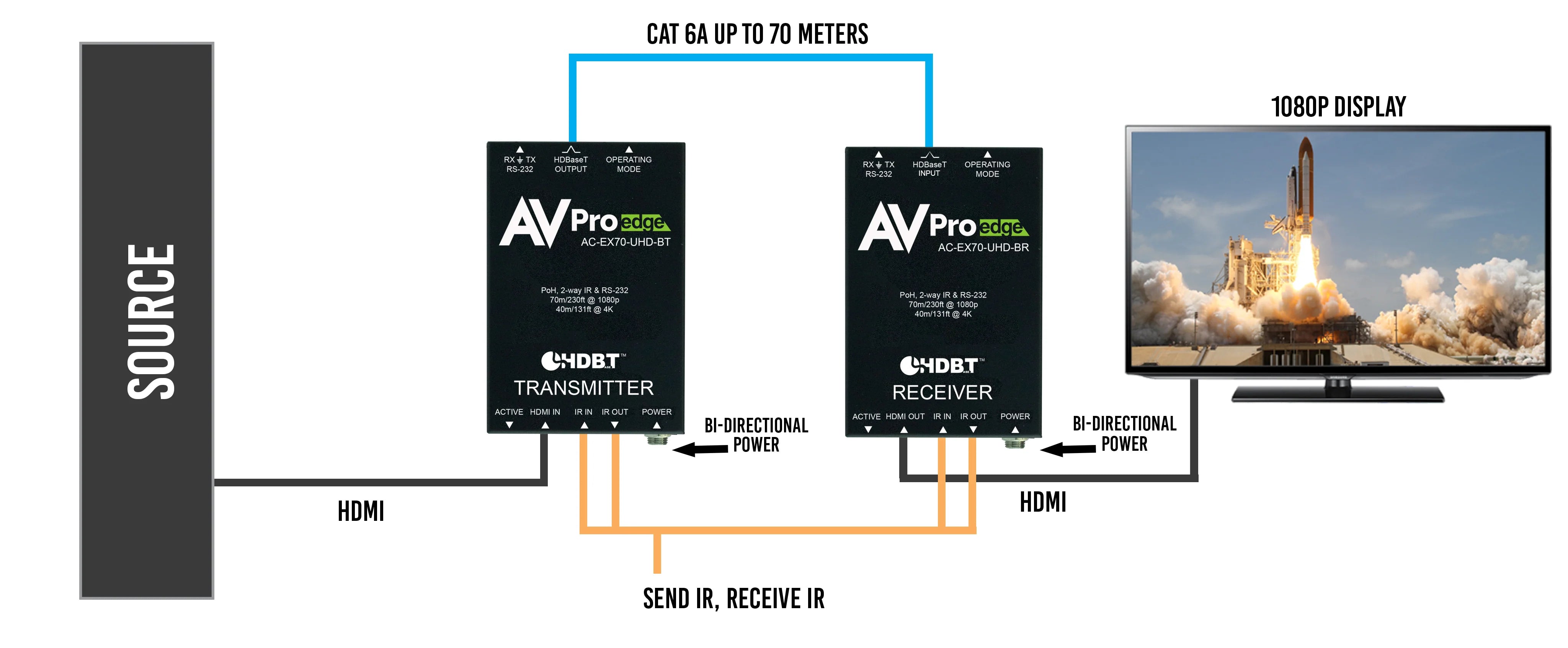 Das Kit überträgt 1080p-HDMI-Signale bis zu 70 Meter und 4K-HDMI-Signale bis zu 40 Meter über handelsübliches CAT6A-Kabel unter Verwendung der HDBaseT-Technologie.