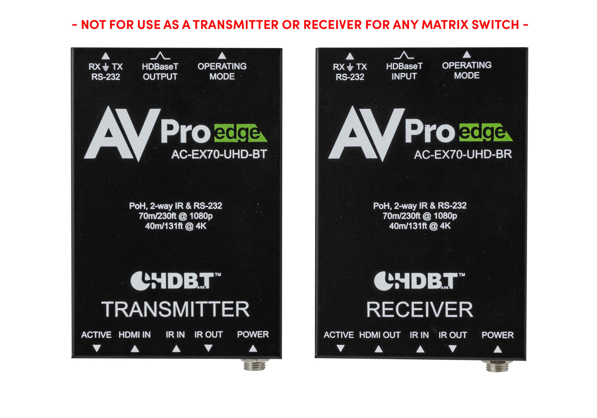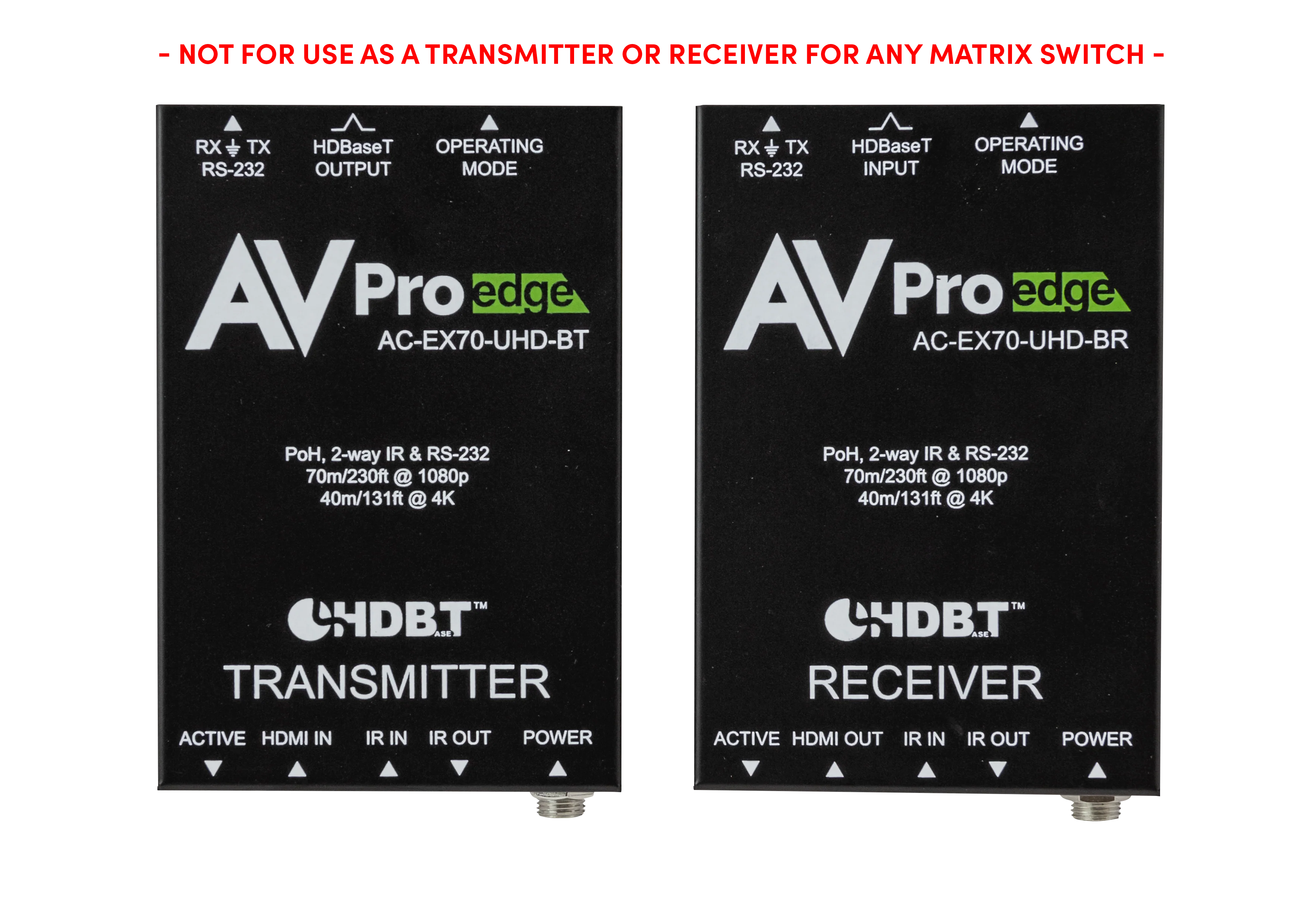 Der AVPro Edge AC-EX70-UHD-BKT ist ein HDMI-Extender-Kit mit Basisfunktionen, das nicht als Transmitter oder Receiver für Matrix-Switch-Systeme verwendet werden darf.