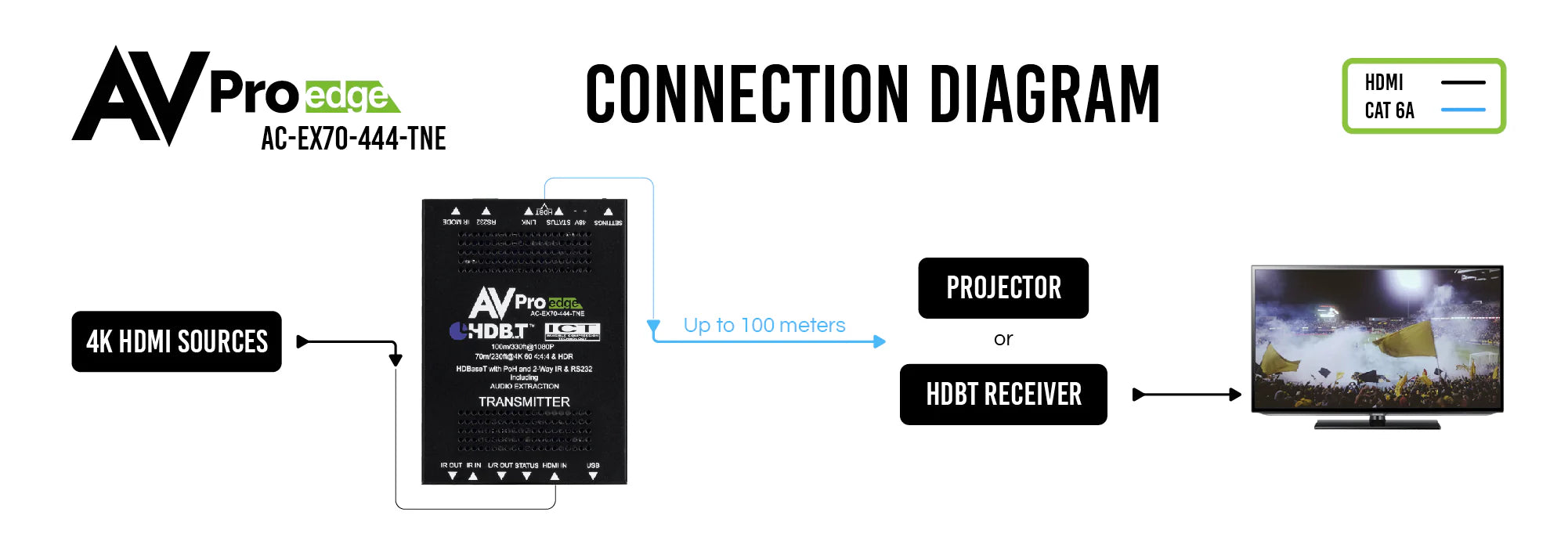 Der AC-EX70-TX ist vollständig kompatibel mit HDBaseT-Technologie und funktioniert mit allen HDBaseT-fähigen Projektoren, Displays oder AV-Receivern.