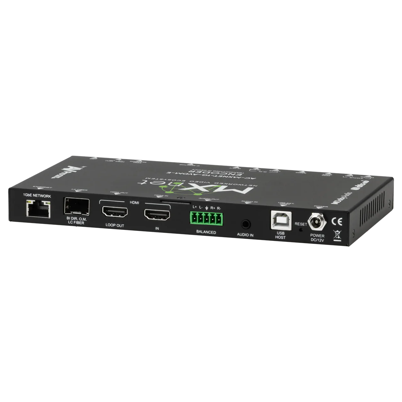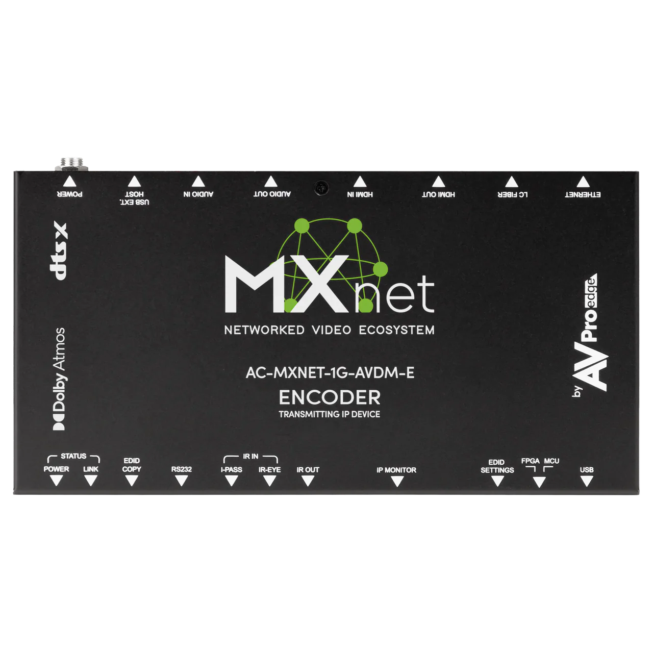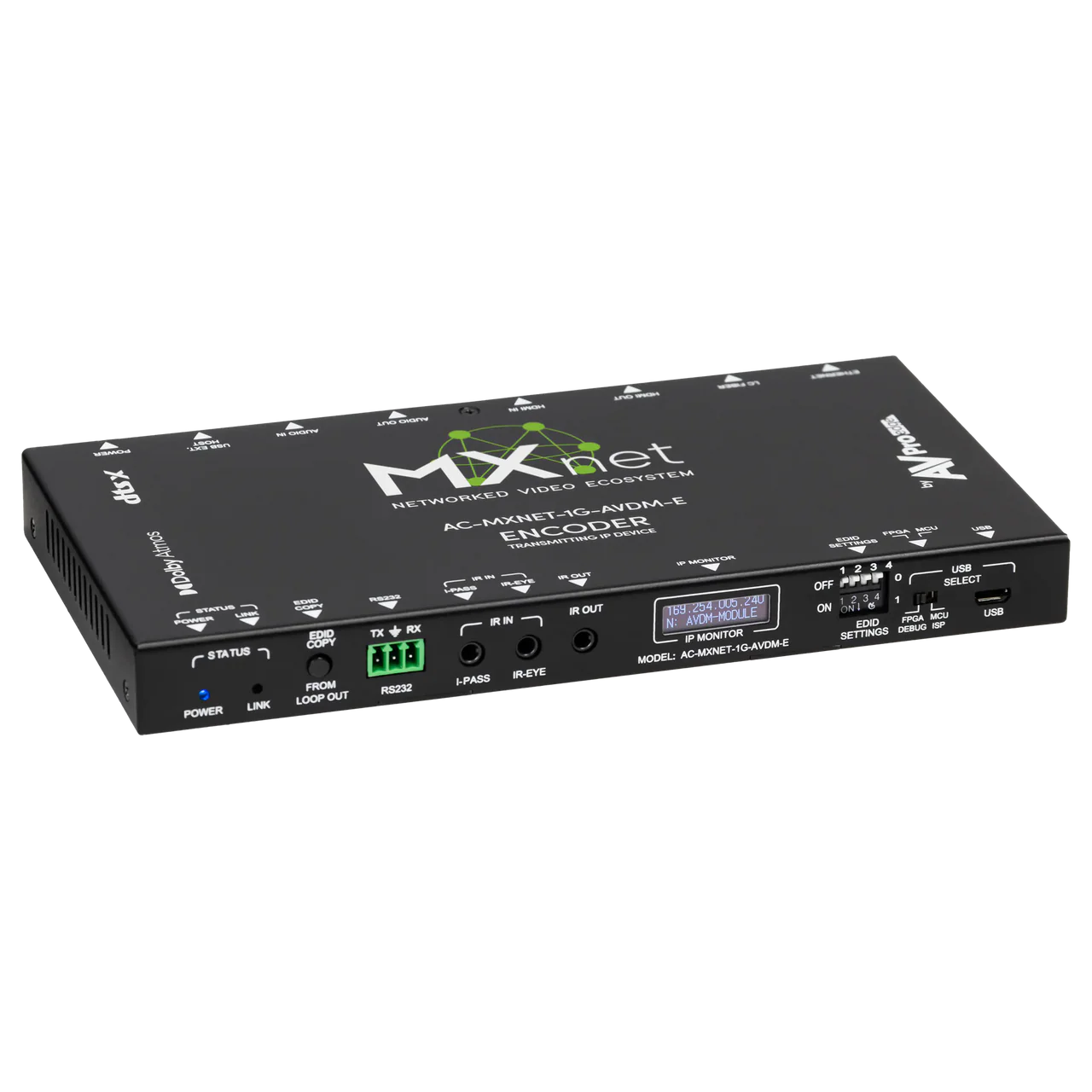 Die Verbindung erfolgt direkt über Kategorie-Kabel (CAT 5e oder besser) oder Glasfaser zu einem MXnet-Switch (AC-MXNET-SW48 oder SW24) oder einem anderen multicast-kompatiblen L3-Managed-Netzwerk-Switch. Der AC-MXNET-1G-AVDM-E Encoder ist Teil des MXnet-Ökosystems von AVPro Edge.