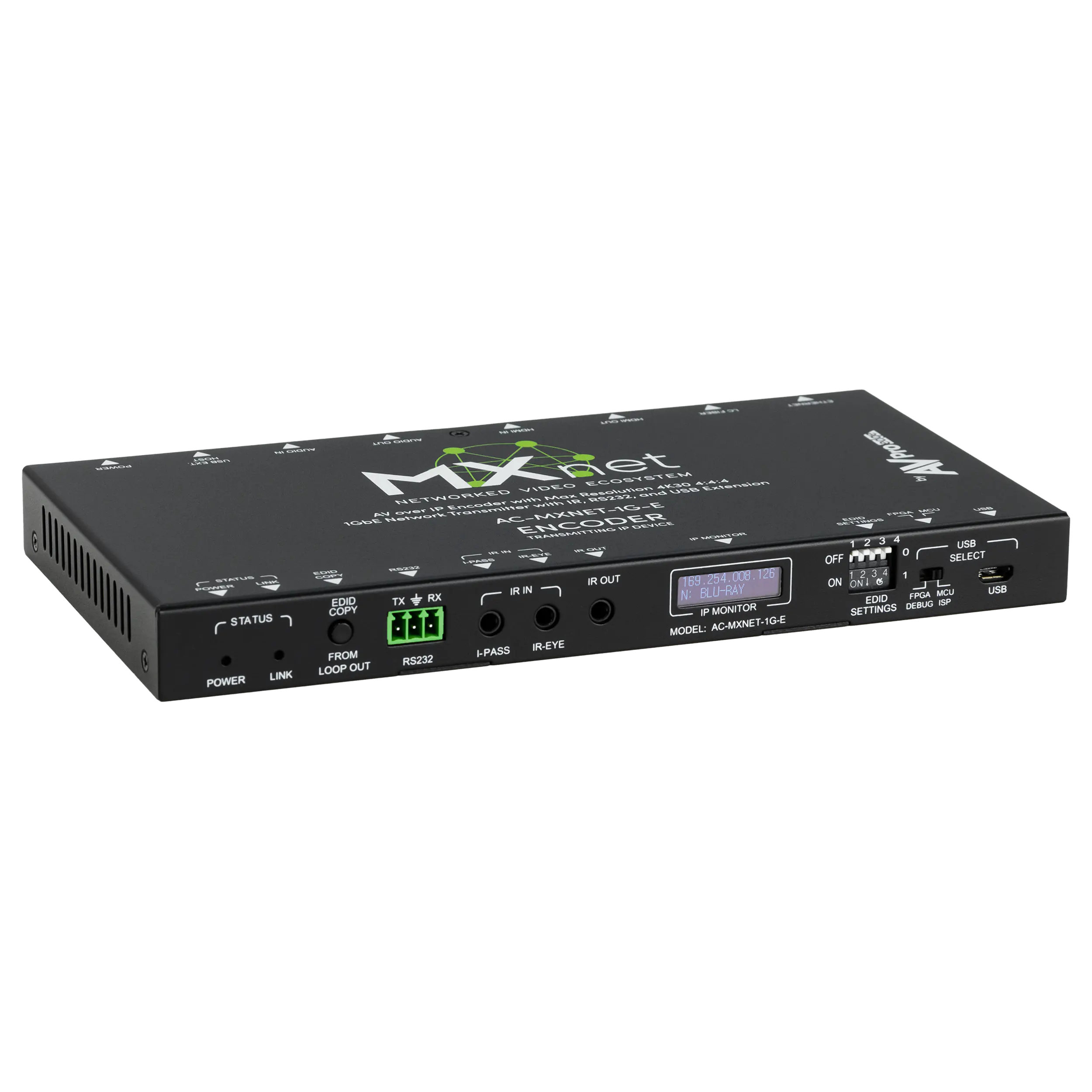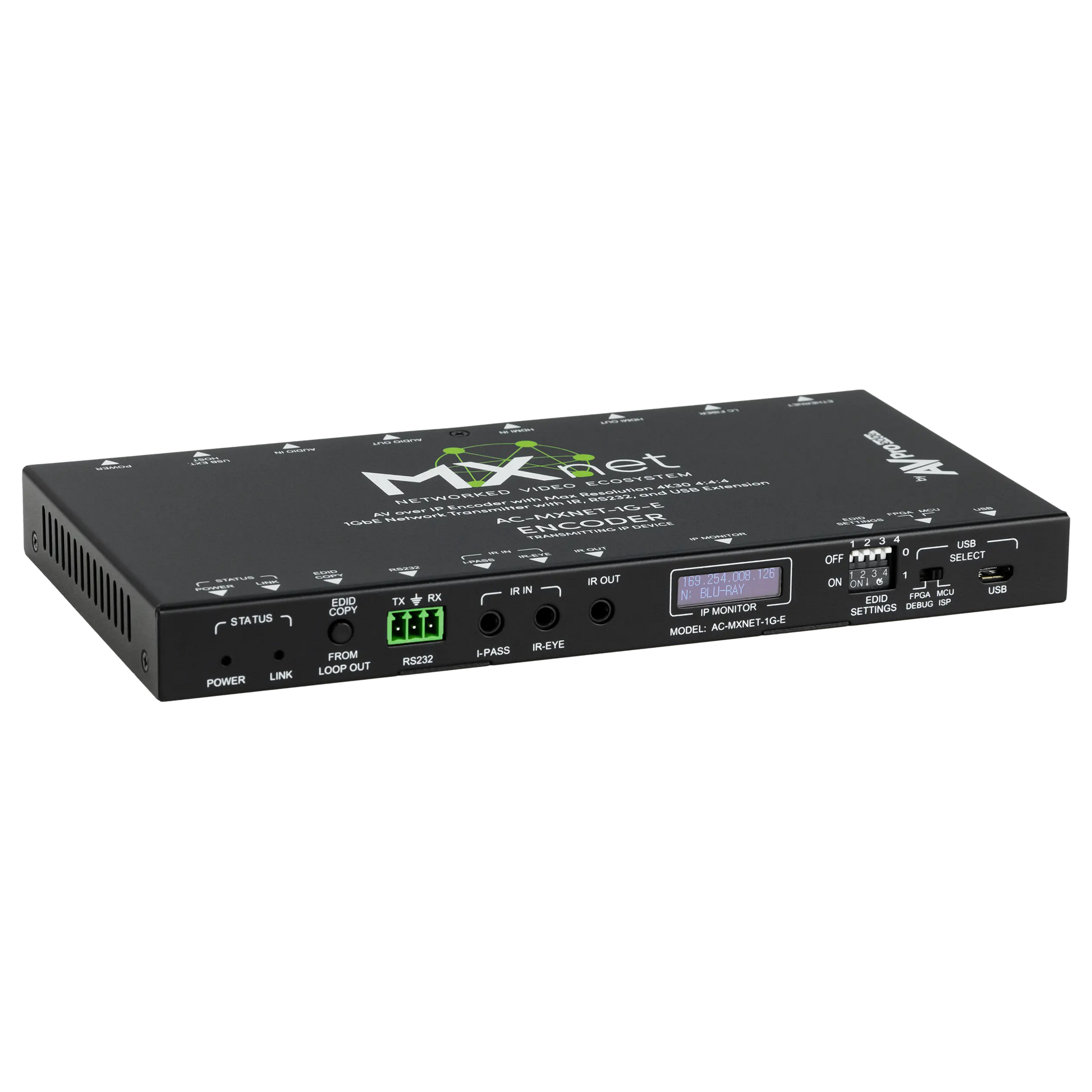 Alle Signale beginnen ihre Reise durch ein MXnet-System, sobald sie den AC-MXNET-1G-E Encoder (Transmitter) erreichen. Nach dem Anschluss – sei es eine HDMI-Quelle, ein analoges Audiosignal, RS-232- oder IR-Steuerdaten oder KVM-Signale – werden sämtliche Eingangssignale in einen Multicast-Datenstrom kodiert, der für die Weiterleitung zu jedem Decoder-Endpunkt innerhalb des Projekts bereitsteht.