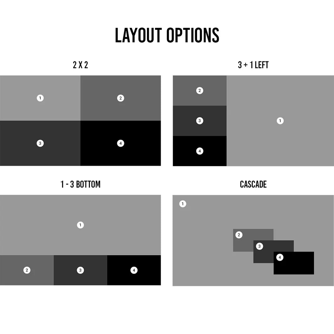 Der Multi-viewer ist mit vier vorkonfigurierten Multiview-Layouts ausgestattet, die einen schnellen Einstieg ermöglichen. Jedes dieser Layouts ist in Echtzeit anpassbar, sodass Fensterpositionen und -größen individuell verändert werden können. -