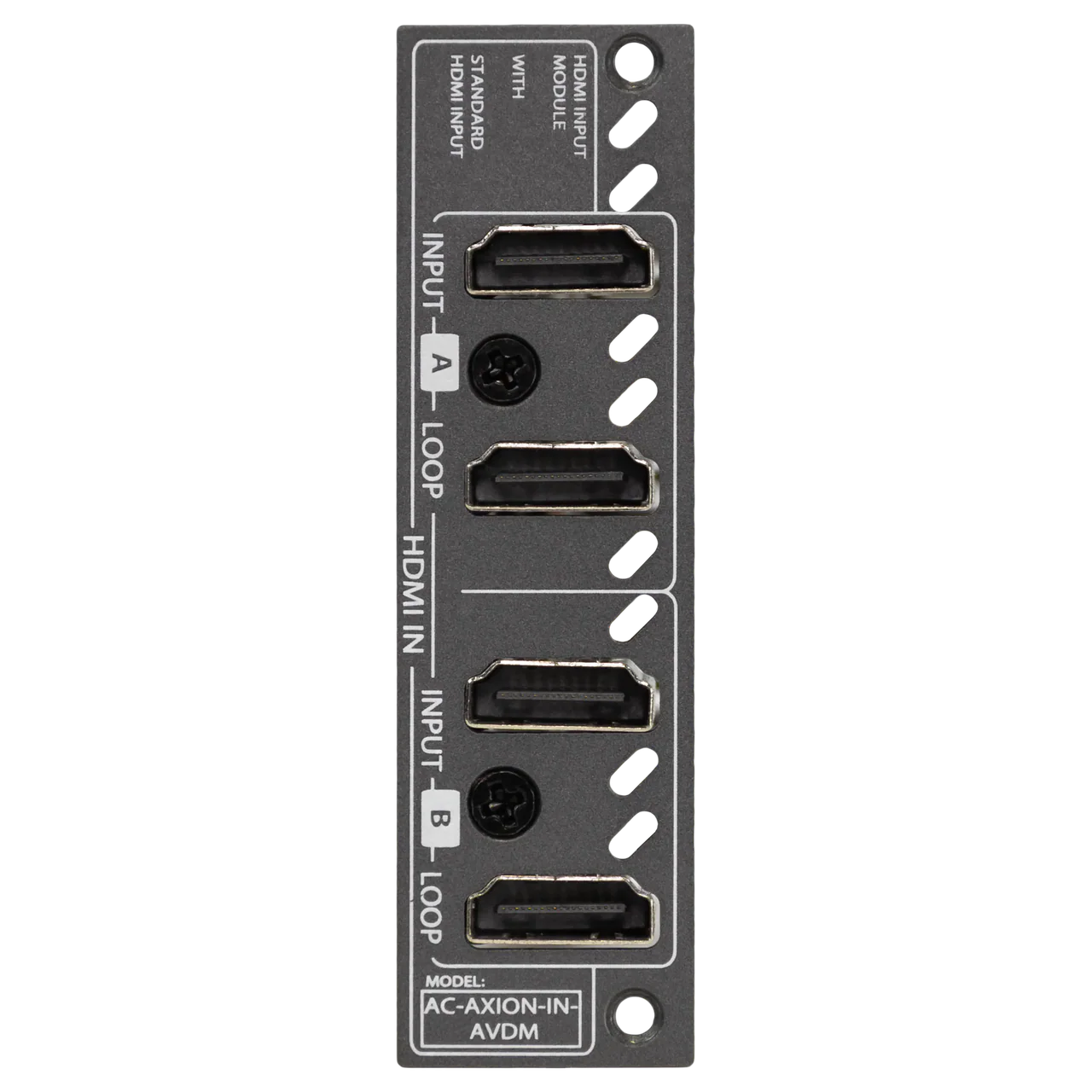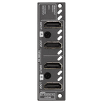 Diese Eingangskarte verfügt über zwei HDMI-Eingangsports mit 18 Gbps, jeweils mit einem gespiegelten HDMI-Loop-Out-Port. Sie unterstützt das Downmixing von Dolby Audio- und DTS-HD-Formaten bis zu 7.1 Kanälen und gibt diese als Stereo (LPCM 2.0) über die gespiegelten HDMI-Loop-Outs oder über die Audio-Extraktion über die 5-poligen symmetrischen Analogausgänge bzw. die digitalen TOSLINK-Ausgänge aus. Diese Ausgänge sind gespiegelt und werden immer auf 2-Kanal-Audio heruntergemischt. Dolby Atmos und DTS:X können extrahiert und als 7.1-Audio ohne objektbasierte Metadaten heruntergemischt oder über die HDMI-Loop-Outs unverändert durchgeschleift werden.