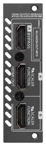 Diese Ausgangskarte verfügt über zwei 18Gbps HDMI-Ausgangsports mit einem einzelnen HDMI-Loop-Out-Port (Ausgang A) sowie MCS (Mission Critical Scaling) für sofortiges „Seamless Switching“ ohne schwarze Bildschirme während der HDMI/HDCP-Synchronisation. Die Karte erlaubt zudem die Einstellung von skalierten Ausgangszeiten für ältere Displays oder Computer-/Industrie-Monitore.
