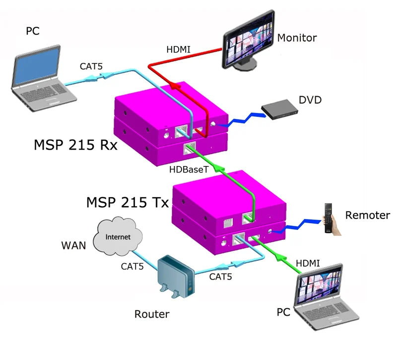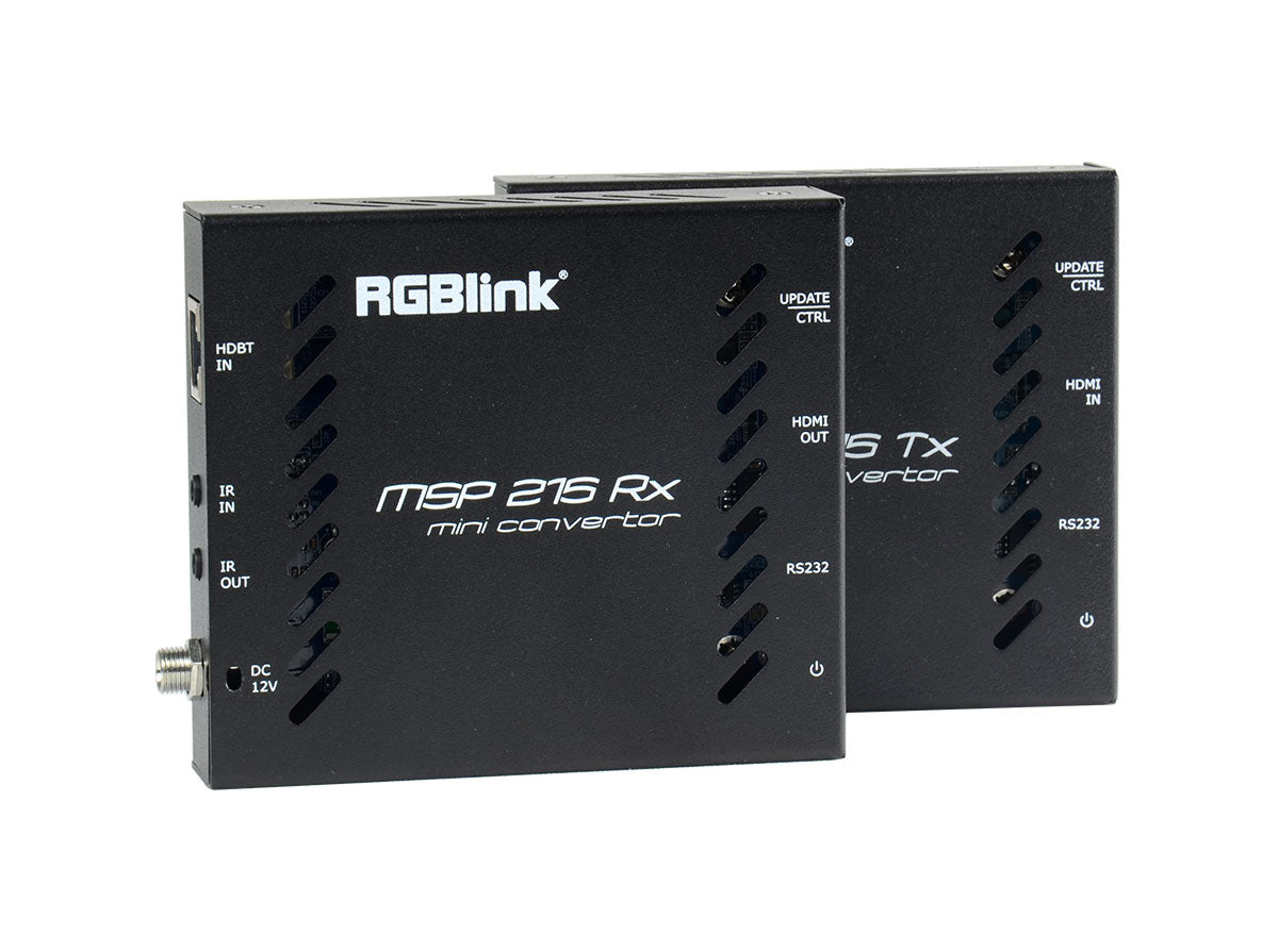 Der MSP 215 HDMI-Extender zur Übertragung über ein einzelnes CAT5-/CAT6-Kabel besteht aus einer Sender-Einheit (MSP 215 Tx) und einer Empfänger-Einheit (MSP 215 Rx).