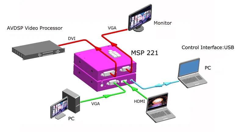 Der MSP221 ist ein EDID- und HDCP-Manager mit Eingängen für HDMI und VGA sowie Ausgängen für DVI und VGA.