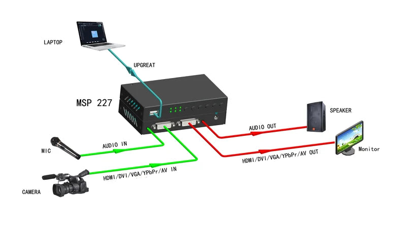 Der MSP227 konvertiert jedes Eingangssignal von AV, YPbPr, VGA, DVI oder HDMI in jedes gewünschte Ausgangssignal derselben Formate (AV/YPbPr/VGA/DVI/HDMI).