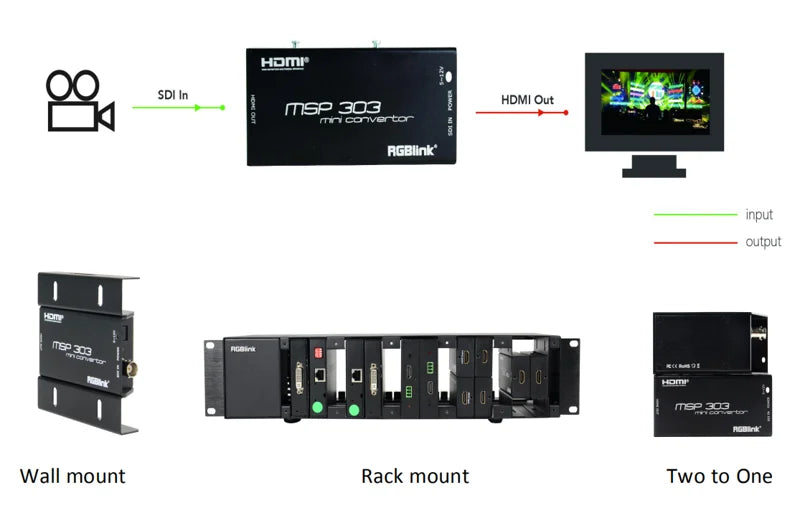 Der MSP303 ist ein SDI-zu-HDMI-Videokonverter und verfügt über einen SDI-Eingang sowie einen HDMI-Ausgang.