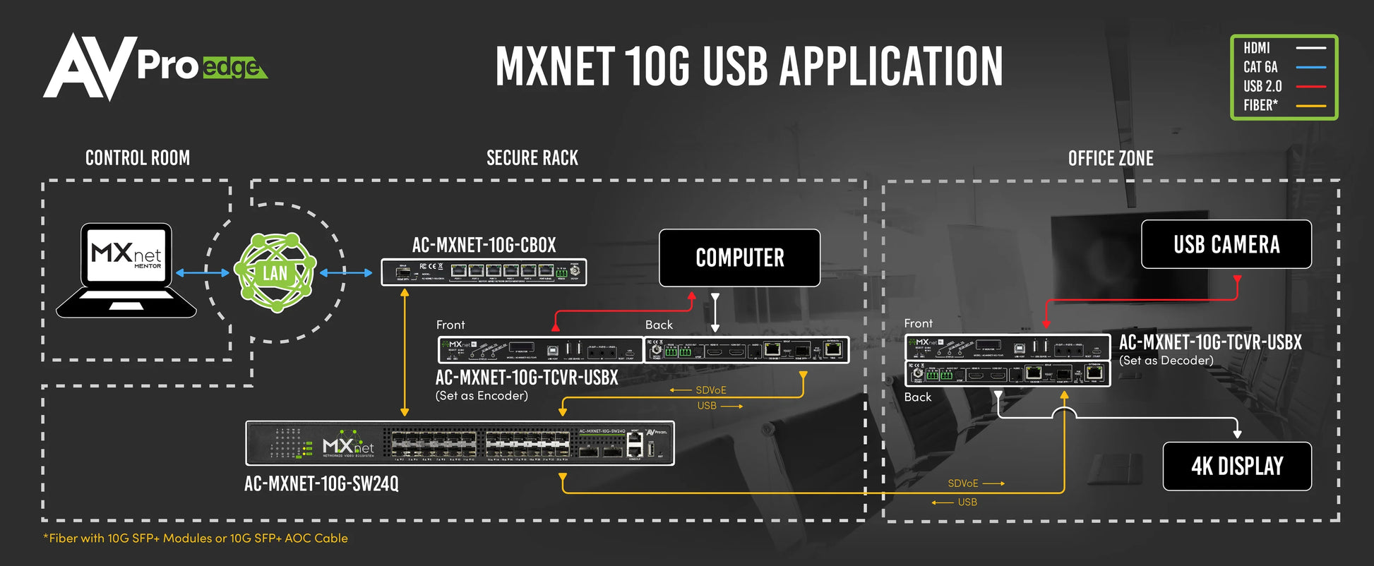 • MXnet-Switches – AVPro Edge-Switches sind für das MXnet 10G-Ökosystem optimiert und gewährleisten die Geschwindigkeit, die für den präzisen Betrieb der ExtremeUSB®-Funktionssuite erforderlich ist.