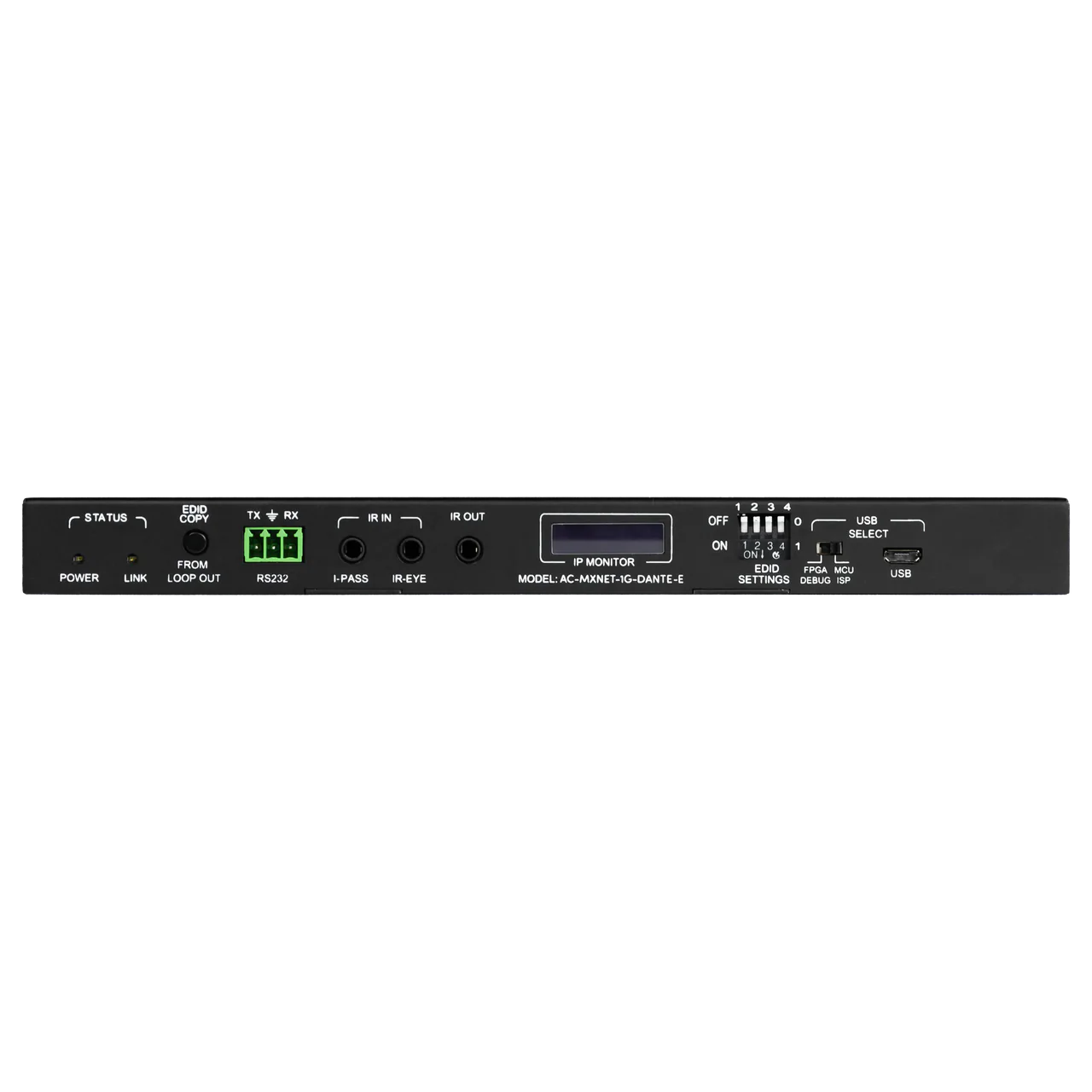 Das erweiterte Gehäuse des AC-MXNET-1G-DANTE-E enthält einen Dante RJ-45 Netzwerkanschluss. Sobald das Gerät eingeschaltet und mit einem Dante-Netzwerk verbunden ist, wird es automatisch erkannt und kann über die Dante Controller Software zur Audioverteilung an Dante-fähige Geräte eingebunden werden – einschließlich anderer AC-MXNET-1G-DANTE-E-Einheiten oder dem AC-DANTE-D Decoder. Die LEDs am Dante-Port zeigen Verbindungsstatus und Aktivität an.