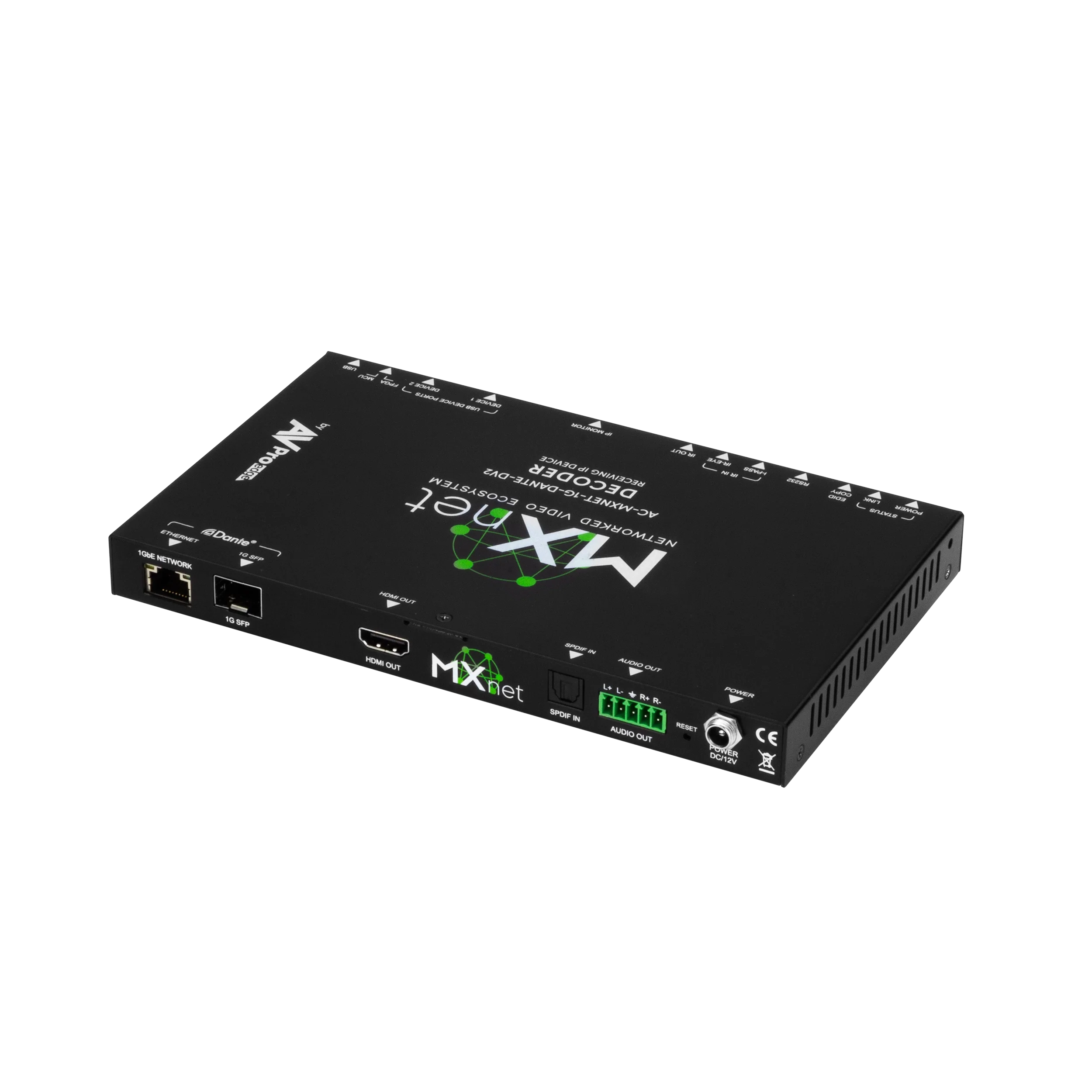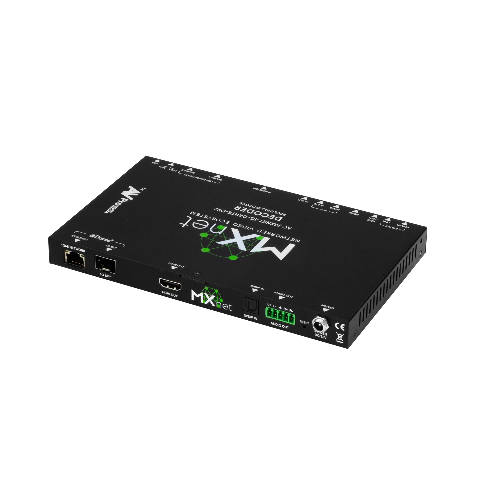 Installationen, die Dante-Audio systematisch einsetzen, aber auf ein unabhängiges Netzwerk auslagern, können nun die Langstreckenverkabelung vereinfachen, indem sie Dante-Streams von einem Encoder (AC-MXNET-1G-DANTE-EV2) zu einem Decoder-Endpunkt (AC-MXNET-1G-DANTE-DV2) übertragen. Diese Decoder fungieren als Breakout-Brücken, um die Signale näher an weitere Dante-Geräte zu bringen. So können z. B. Dante-fähige Verstärker physisch näher an die Lautsprecher platziert werden, die sie versorgen – was die 100-Meter-Grenze von Audinate für Dante über CAT-Kabel überwinden und gleichzeitig die Länge der Kabel zu passiven Lautsprechern minimieren kann. Auch aktive Lautsprecher mit Dante profitieren von zentralisierten Stream-Routen. Kreative Systemplanung führt schnell zu Material- und Arbeitsersparnis.