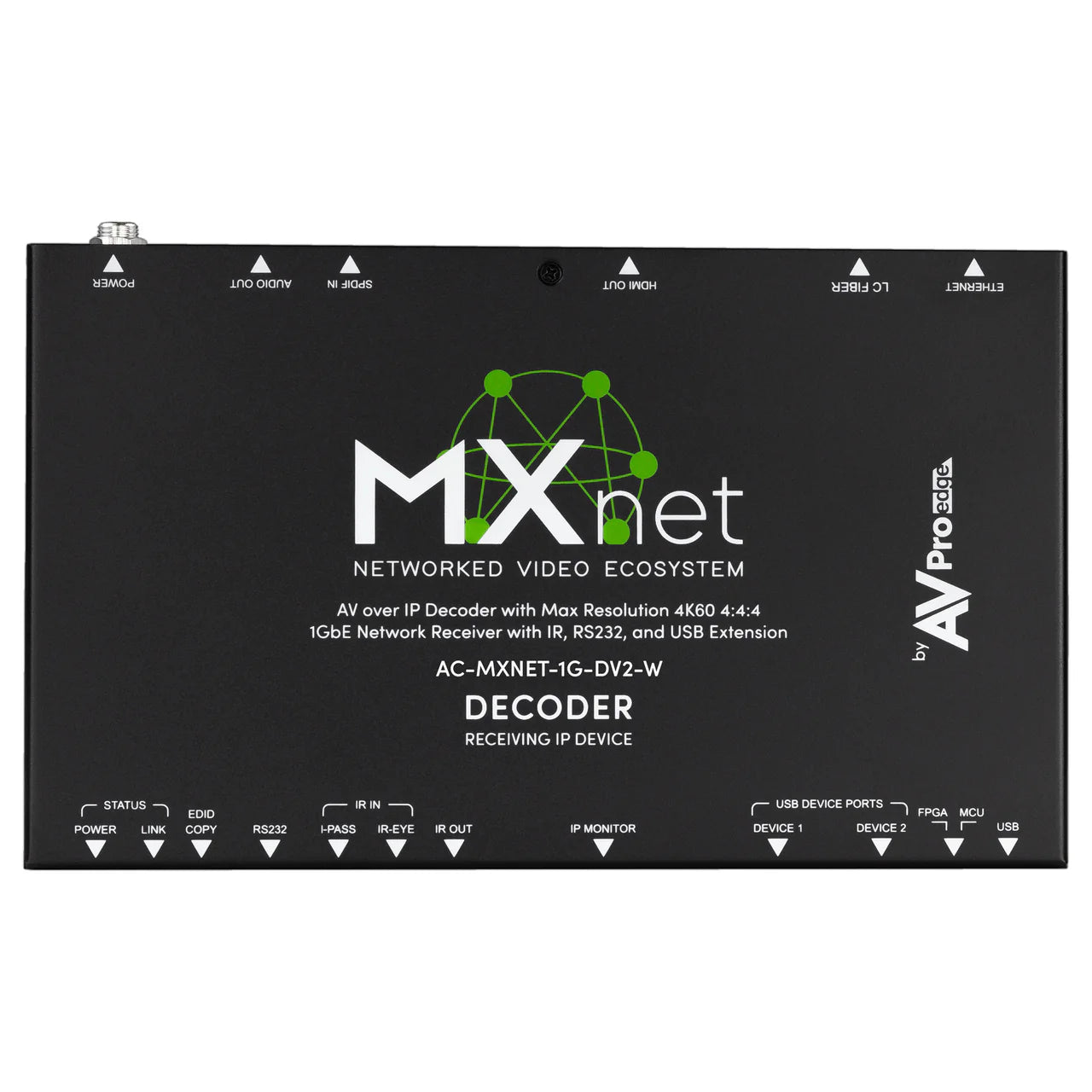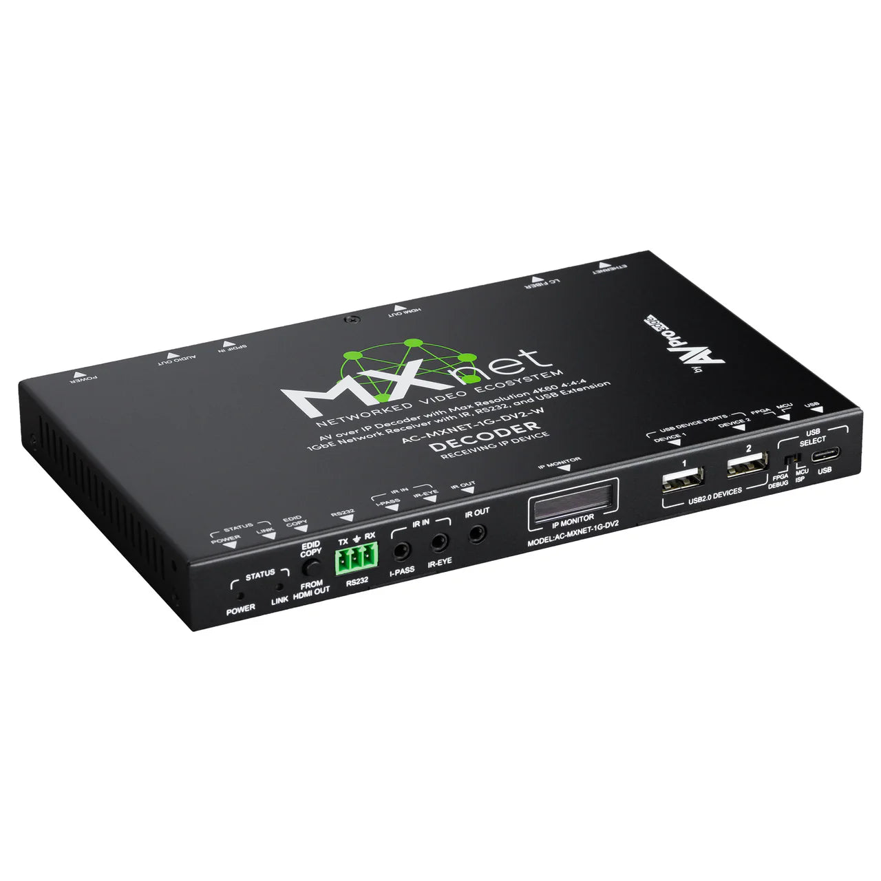 - Control Signal Routing – AC-MXNET-1G-DV2 Decoder empfangen IR- und RS-232-Steuersignale, die mit der MXnet Mentor Software zugewiesen und von AC-MXNET-1G-EV2 Encodern für Multicast paketiert wurden. I-PASS- und IR-EYE-Ports unterstützen die IR-Signalweiterleitung von Drittanbieter-Steuerungssystemen zu AC-MXNET-1G-DV2 Decodern und angeschlossenen Endgeräten.