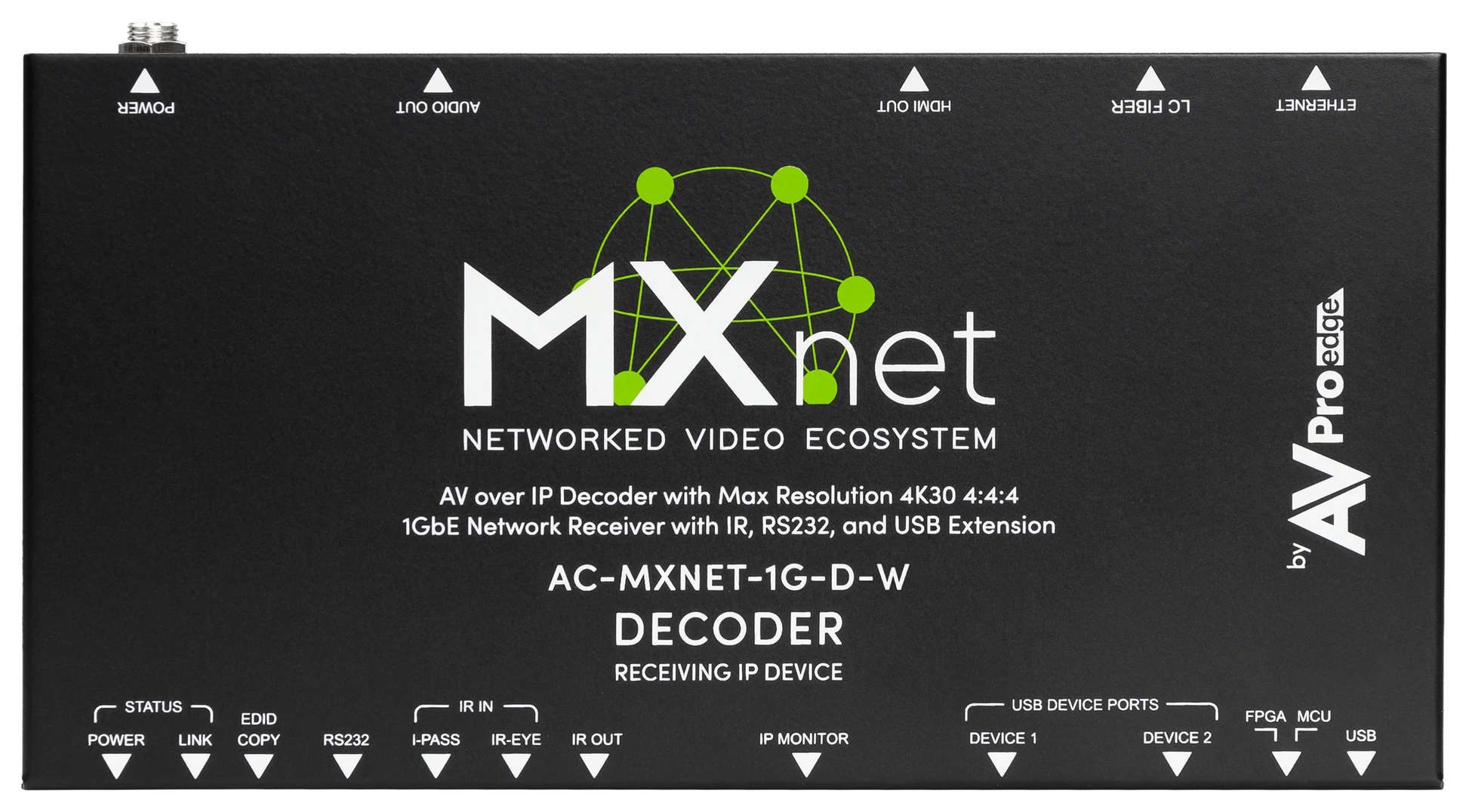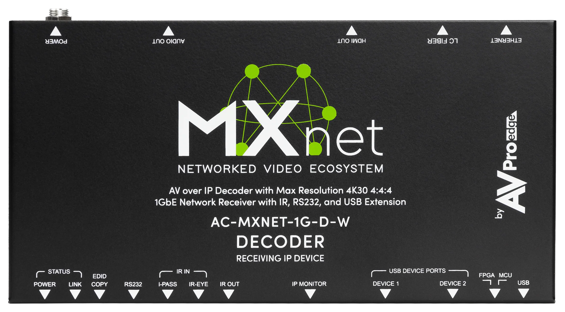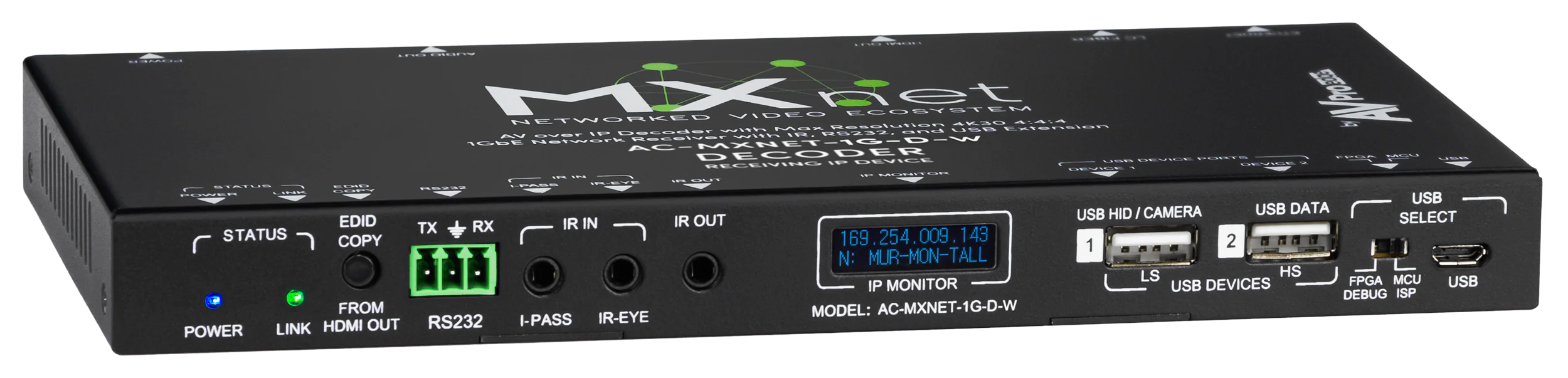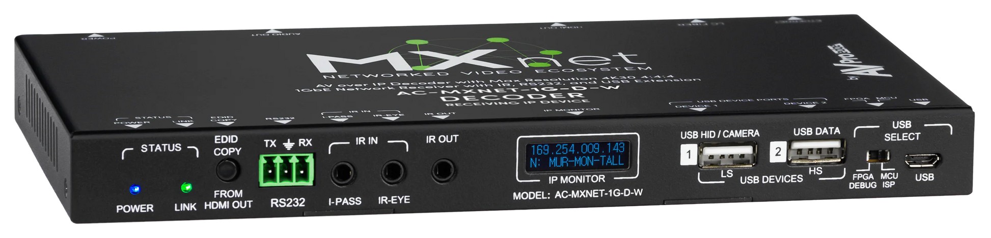 - USB and KVM Support – Jede Decoder-Einheit verfügt über zwei USB-Ports. Bei Bedarf kann ein USB-Hub angeschlossen werden, um die Anzahl der Ports zu erweitern. USB-Signale können zurück zum Encoder-Host geleitet werden. Mit der MXnet Mentor Software lässt sich der Host-Encoder festlegen und das angeschlossene USB-Gerät dem gewünschten Decoder zuordnen.