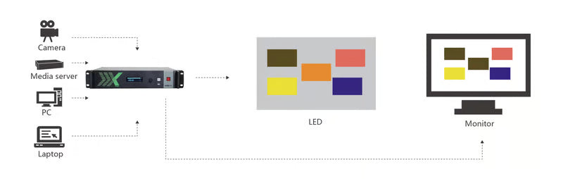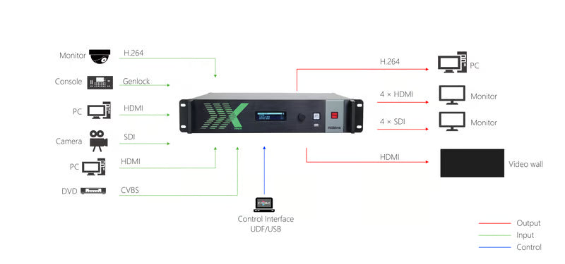 Zu den verfügbaren Ausgangssignalen gehören HDMI, 3G-SDI, HDBaseT und H.264. Auf der Eingangsseite stehen ebenfalls vier Slots zur Verfügung, die bis zu 16 Videoeingänge unterstützen. Die Eingangsoptionen umfassen VGA, CVBS, USB-Medien, 3G-SDI, HDBaseT sowie eine Multi-Signal-4K-Eingangsoption.