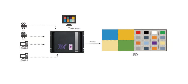 Die Ausgabedisplays/-monitore werden auf einer virtuellen Leinwand bzw. einem Pixelraum konfiguriert, und mehrere Videoquellen können flexibel über diesen Pixelraum verteilt und als Layer angeordnet werden – dies bietet ein außergewöhnliches Maß an Flexibilität. Mit einer Ausgabekapazität von 128 Megapixeln vereint der X7 Multi-Signal- und Multi-Display-Anwendungen zu einem einheitlichen, dynamischen System.